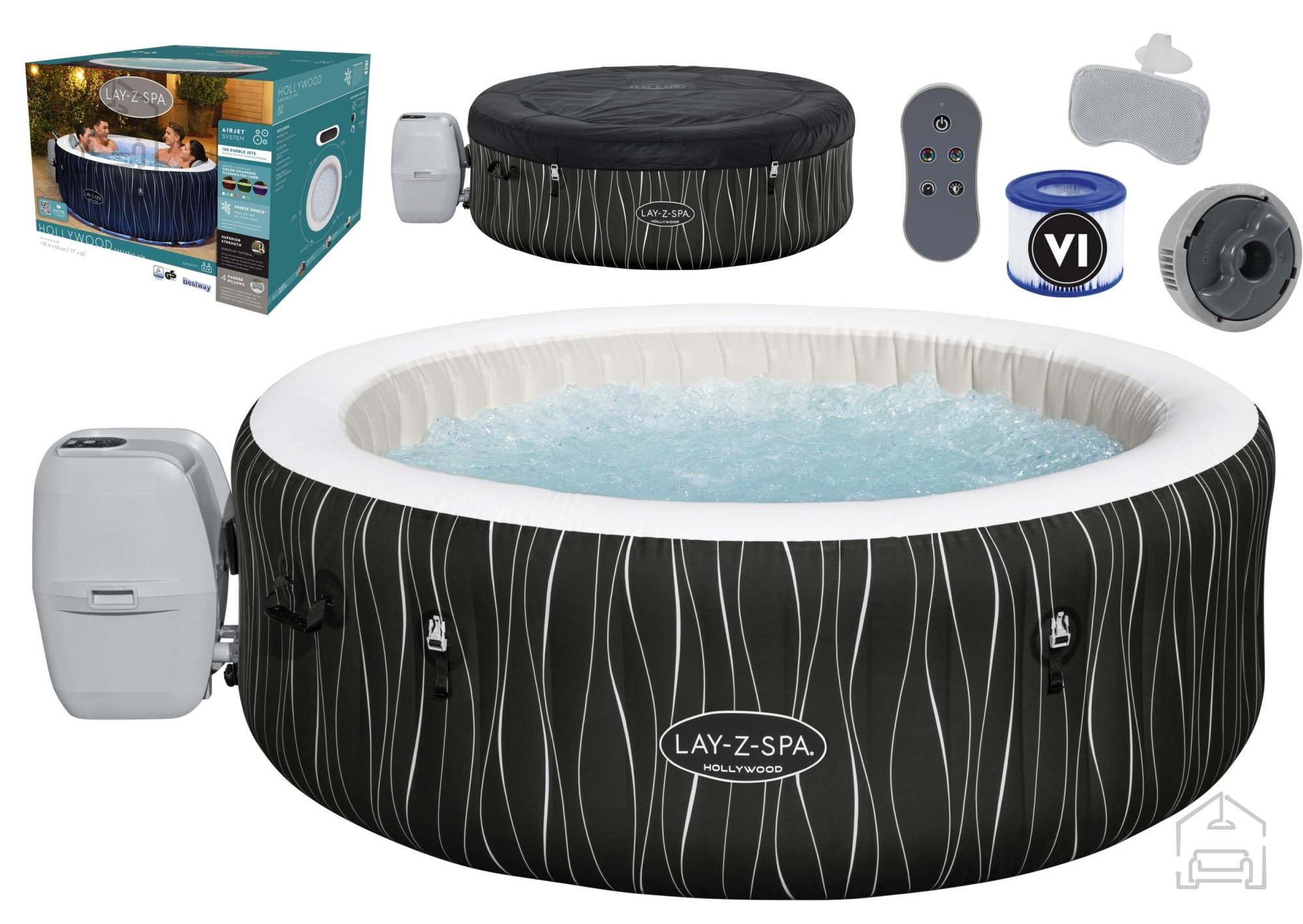 Jacuzzi Lay-Z-Spa Hollywood AirJet je sproščujoča izbira za 4–6 odraslih oseb. Zahvaljujoč tehnologiji AirJet™ in sistemu prijetne masaže z mehurčki ponuja izjemno sprostitev. Izdelano je iz izjemno trpežnega materiala DuraPlus™, ki zagotavlja dolgotrajnost in odpornost proti poškodbam. Sistem ogrevanja Freeze Shield™ preprečuje zmrzovanje vode, energijsko varčen grelni sistem pa omogoča natančno nastavitev temperature vode. S pomočjo digitalnega nadzornega panela in vgrajene črpalke je jacuzzi enostaven za uporabo.