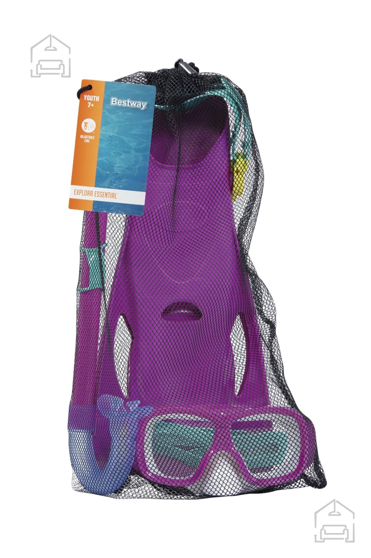 Čeprav so dimenzije posameznih delov v podatkih navedene kot 0x0x0 cm, to pomeni, da so mere odvisne od posameznega kosa v kompletu. V praksi komplet običajno vključuje osnovne elemente, kot so plavuti, maska in dihalko, zasnovane za rekreativno potapljanje ali snorklanje. Glavni namen kompleta je zagotoviti udobno in varno izkušnjo pri plavanju ter omogočiti jasen pogled pod vodo.
