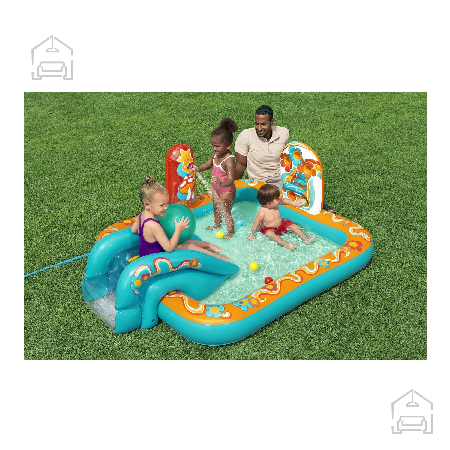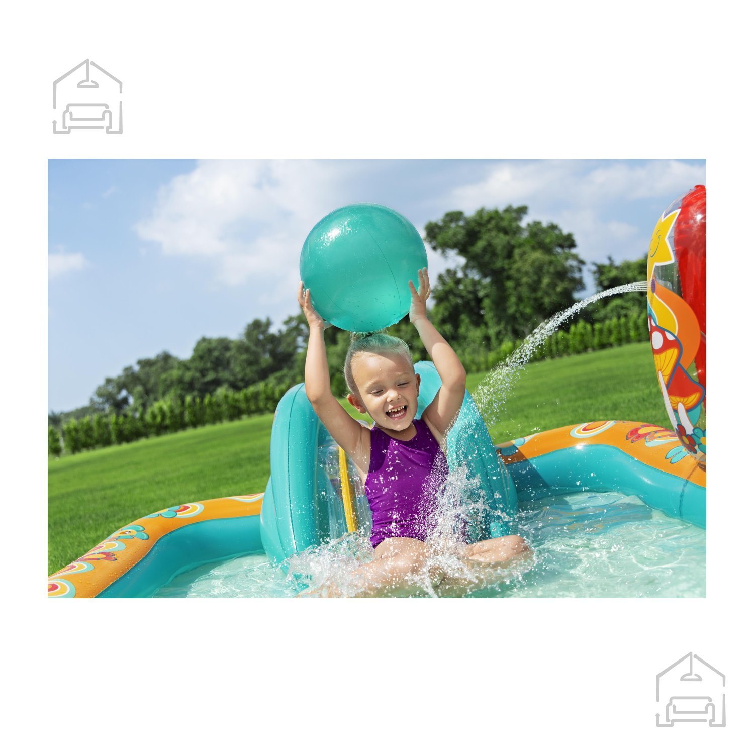 Napihljivo igrišče oziroma bazen s toboganom dimenzij 193x152x74 cm ponuja otrokom odlično zabavo na prostem. Vodni tobogan, velika igralna površina in primerna globina bazena zagotavljajo veselje in udobje v vročih poletnih dneh. Idealno za vrt – igrišče omogoča čudovito vodno zabavo ter spodbuja telesno spretnost in koordinacijo otrok.