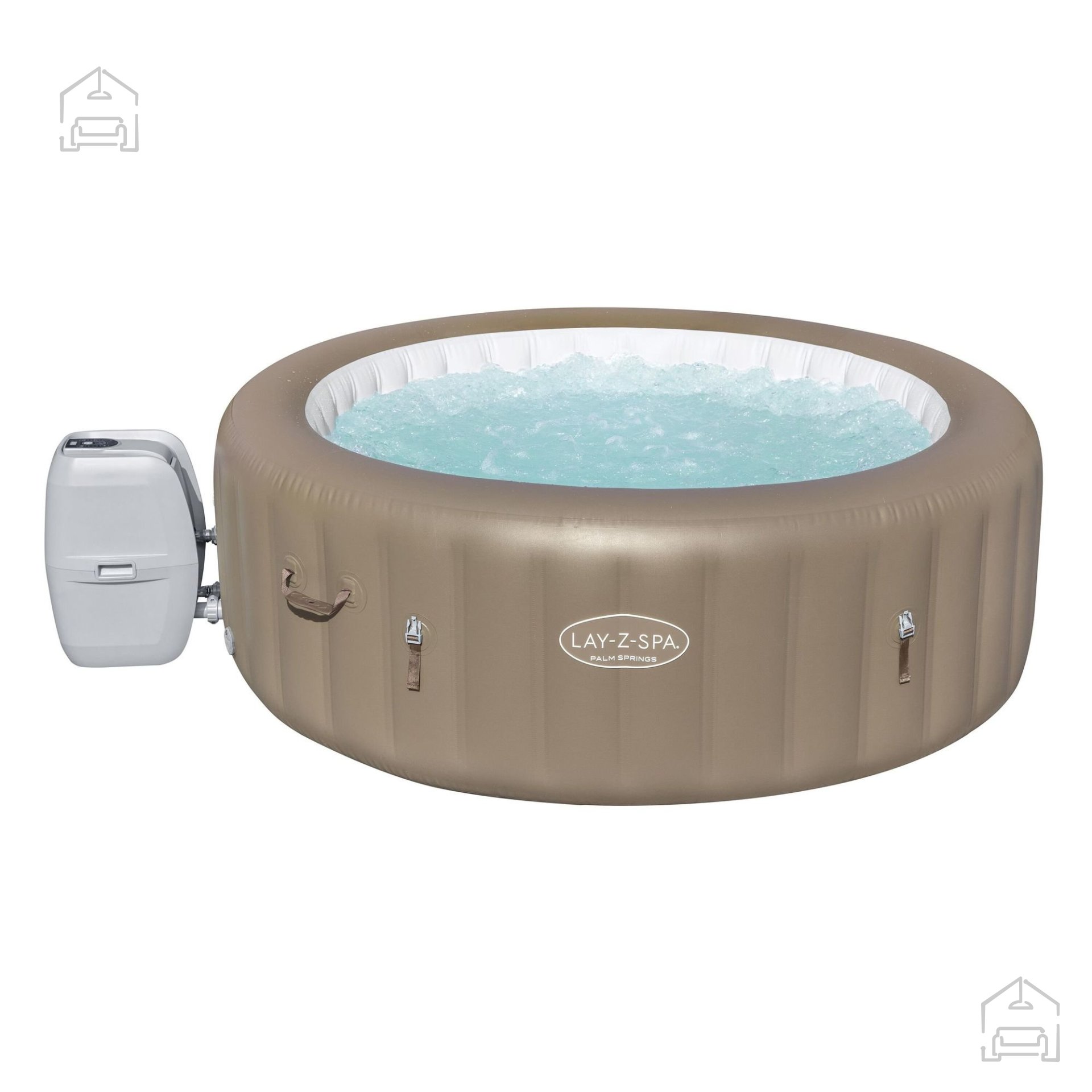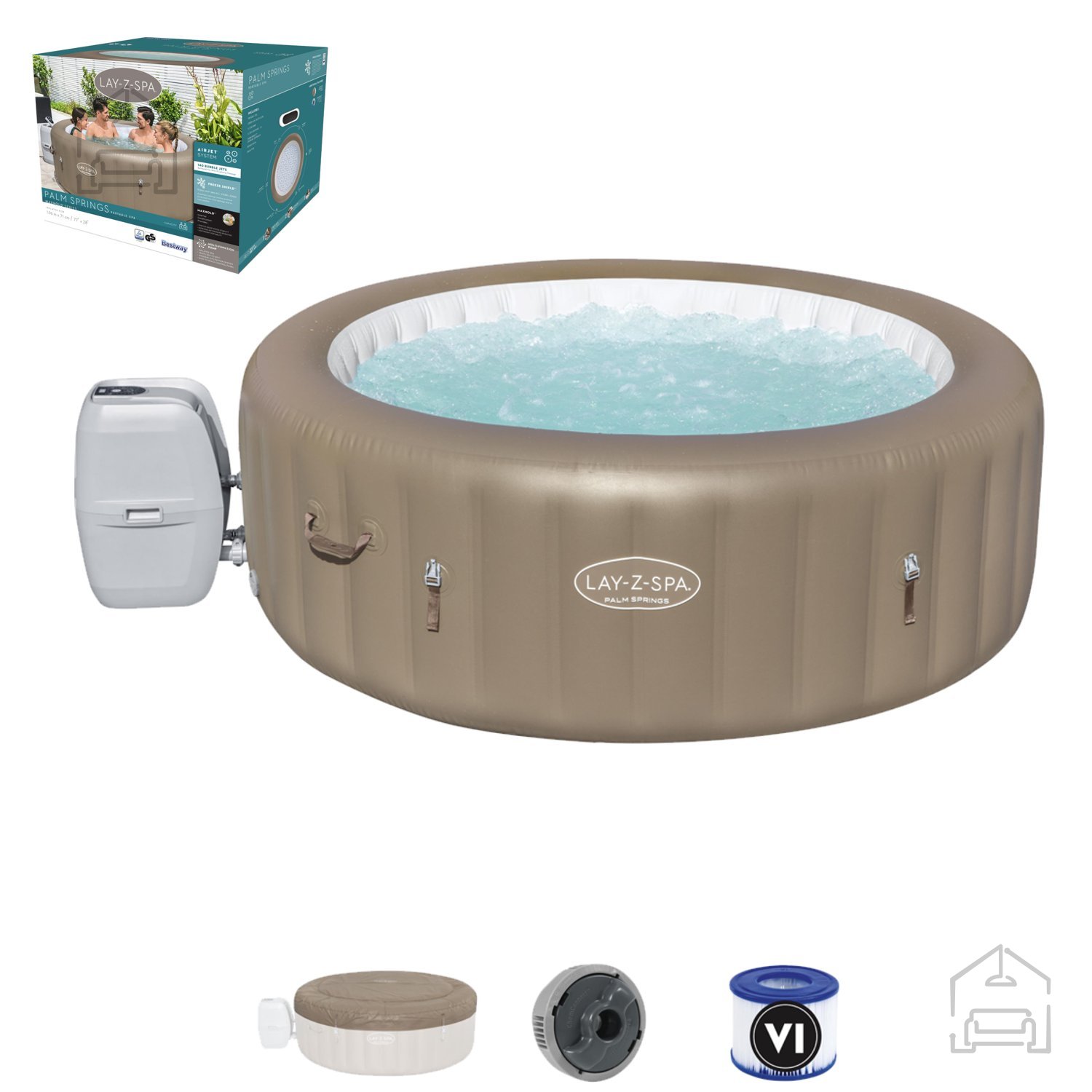 Jacuzzi Lay-Z-Spa Palm Springs AirJet je udobno spa, ki sprejme od 4 do 6 oseb. Dimenzije po napihovanju so 1,96 m x 71 cm, notranja velikost pa znaša 1,46 m. Zahvaljujoč tehnologiji AirJet™ s 140 šobami jacuzzi ponuja izjemno doživetje masaže z mehurčki. Sistem ogrevanja omogoča hitro segrevanje vode do največ 40 °C. Vgrajen sistem filtracije vode in dozirnik ChemConnect™ skrbita za čistočo in stabilno raven klora, kar zagotavlja udobno uporabo skozi celotno sezono.