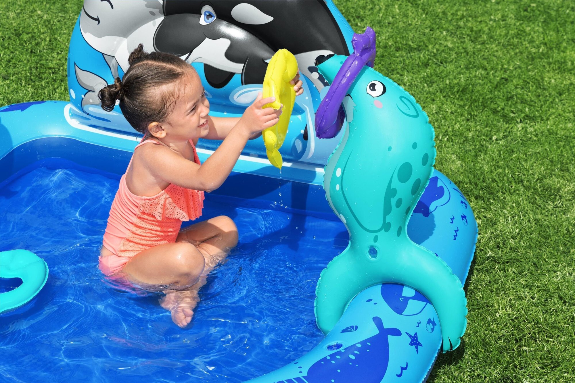 Modra barva igralnega centra Polar Pals ustvarja občutek mirnosti in povezanosti z vodo ter ledom, kar ustreza motivu polarnega okolja. Ta ton je priljubljen med otroki in se lepo dopolnjuje z drugimi barvami zunanjih igral ali bazenov. Zaradi univerzalne barvne sheme se izdelek estetsko poda v različna okolja – od vrtov do notranjih igralnic.