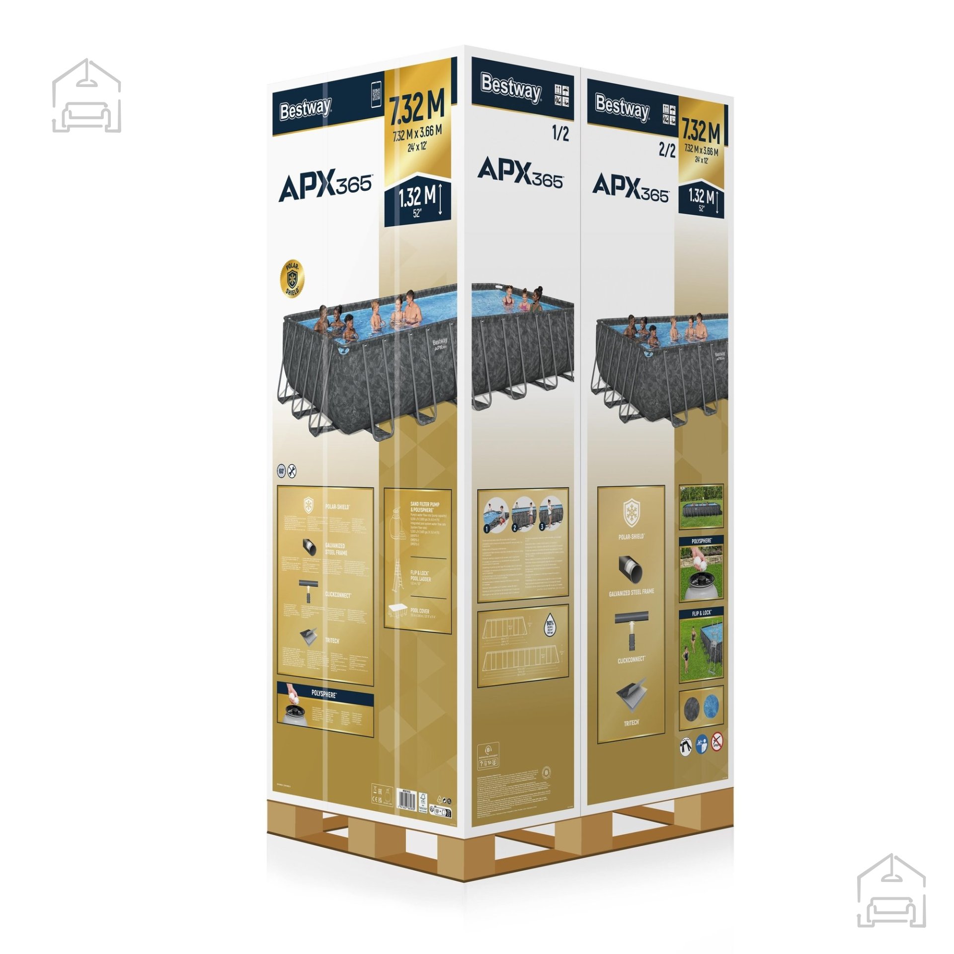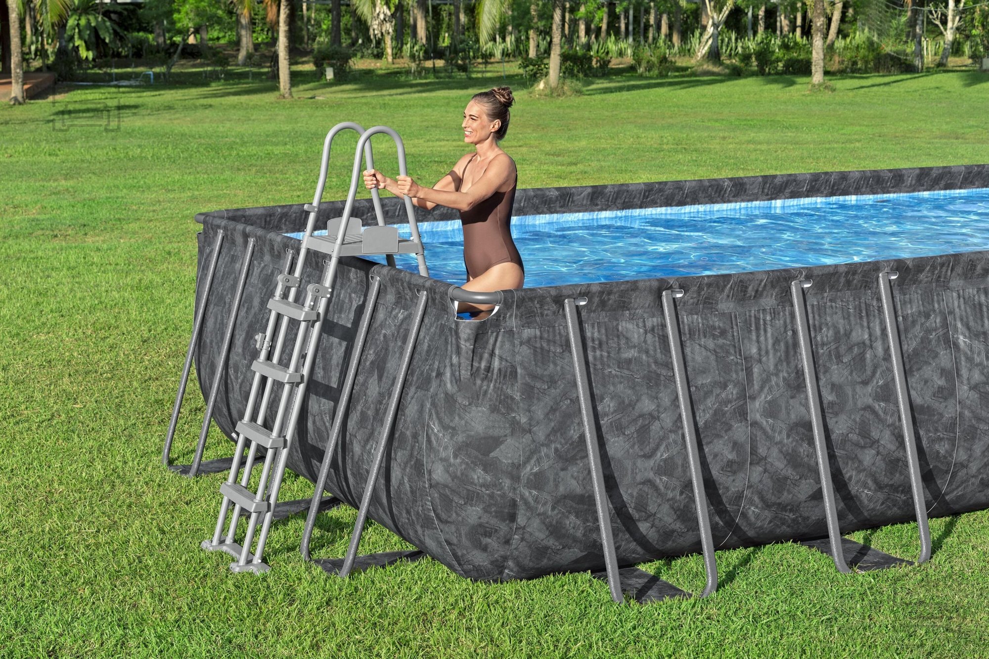 Prostoren bazen s kovinskim ogrodjem dimenzij 7,32x3,66x1,32 m je idealna izbira za vse, ki iščejo udoben in trpežen vrtni bazen. Trdna jeklena konstrukcija zagotavlja stabilnost, velika prostornina pa omogoča, da bazen hkrati uporablja več oseb. Pesčna črpalka skrbi za učinkovito filtracijo, zato voda ostane čista dolgo časa. Lestev omogoča varno vstopanje in izstopanje, pokrivalo pa ščiti bazensko školjko pred umazanijo.