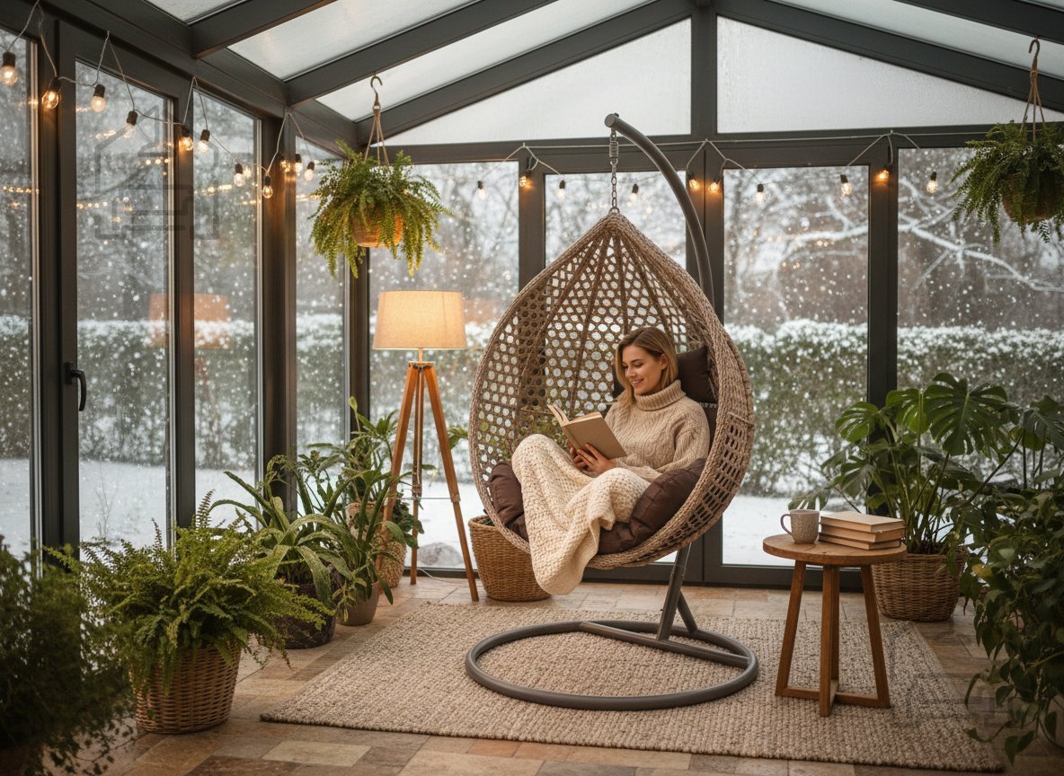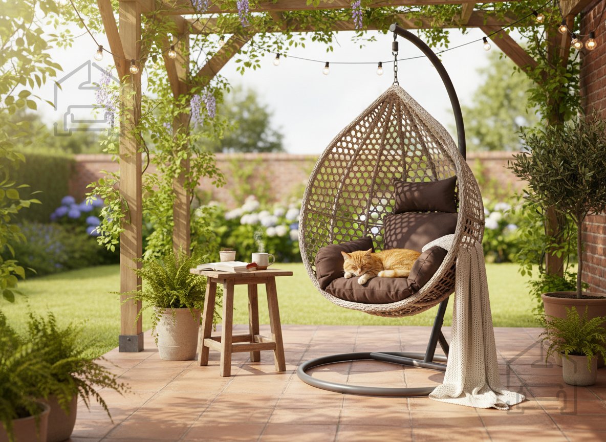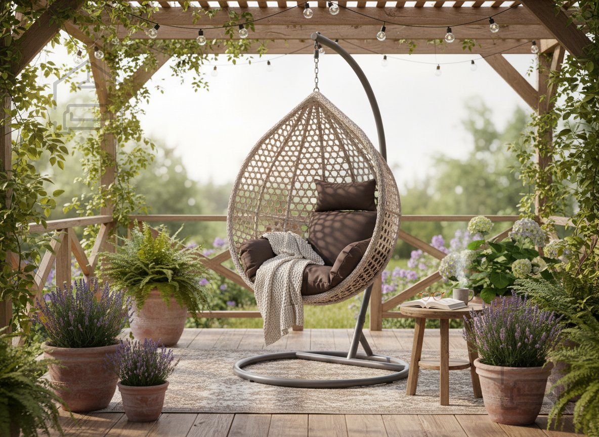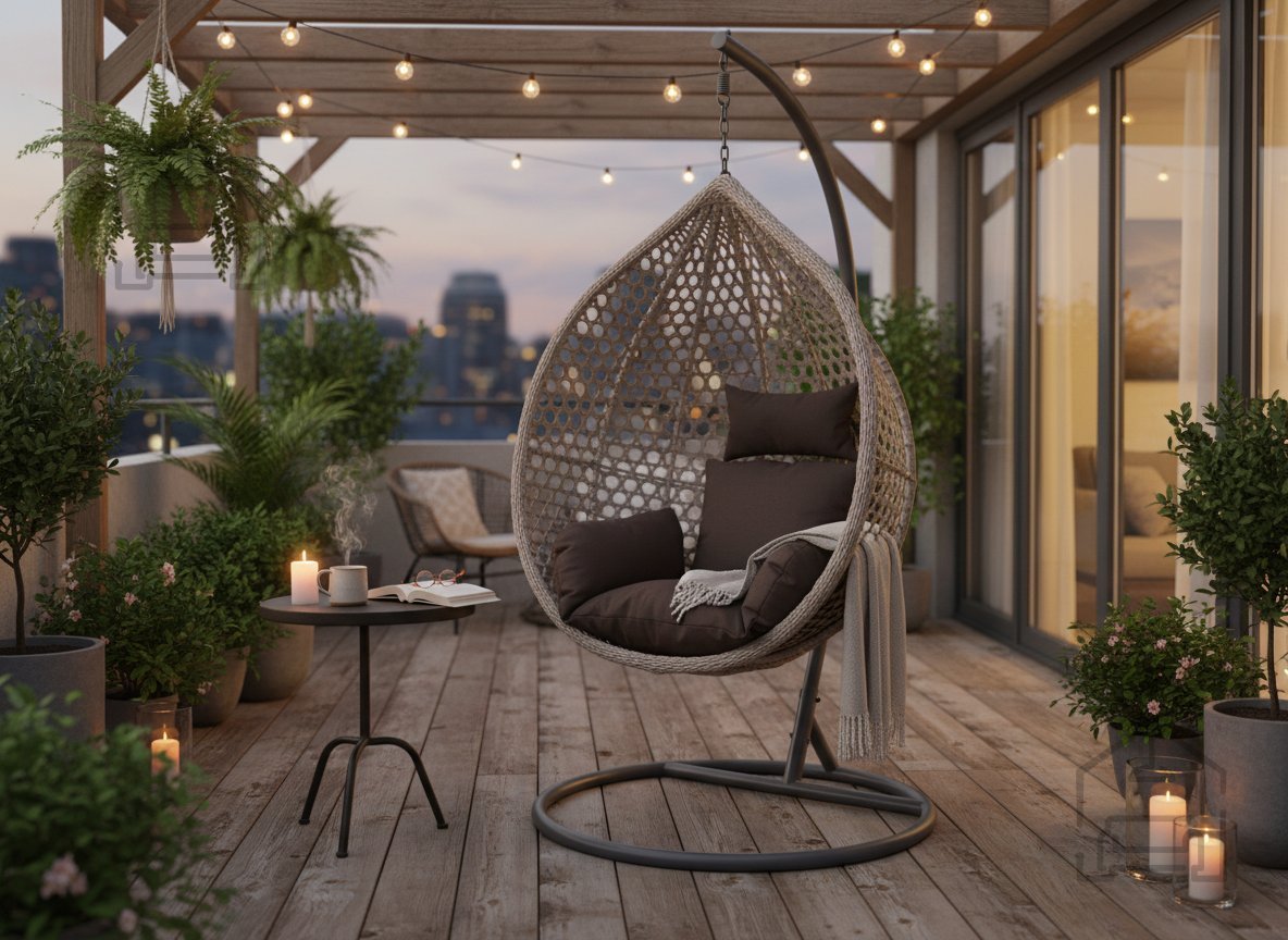 Ta sivi viseči fotelj je eleganten dekorativni element in udoben kotiček za sprostitev v enem. Idealen je za vse, ki cenijo preprostost, funkcionalnost in prefinjen slog. Odlično se poda v vsak prostor – od mestnega balkona do modernega vrta.