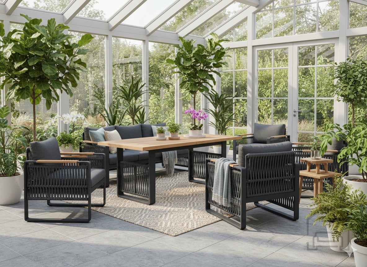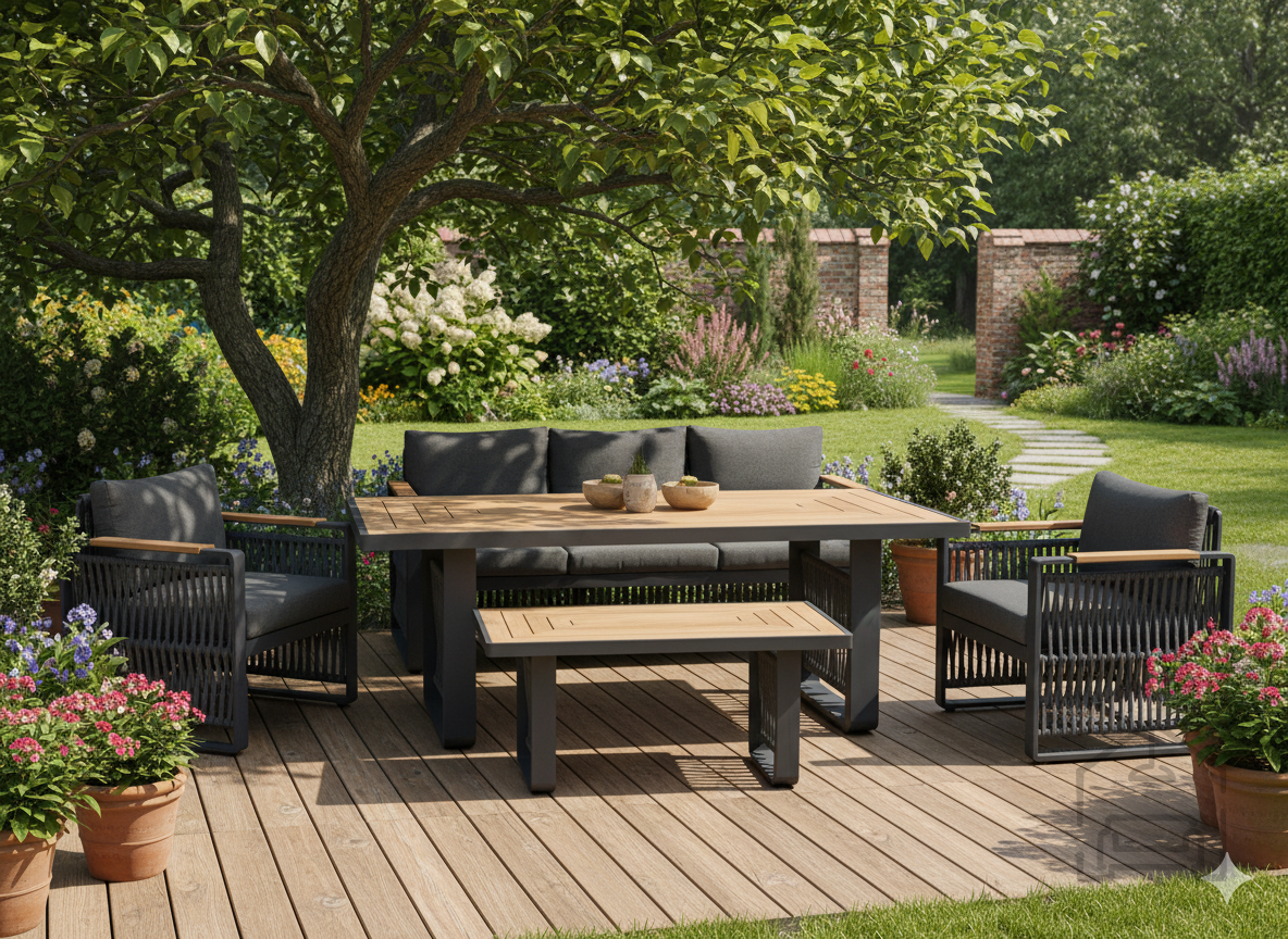 Ta vrtni komplet je ustvarjen za vse, ki pričakujejo več kot le standardno opremo za zunanji prostor. Povezuje razkošen videz, funkcionalnost in trajnost ter se odlično obnese v vrtovih, na terasah in v prestižnih sprostitvenih prostorih.