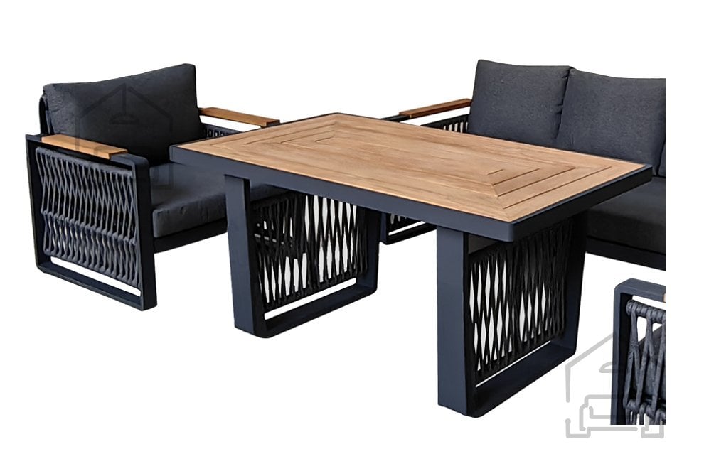 Ustvarite elegantno in udobno sprostitveno oazo na vrtu, terasi ali dvorišču. Ta 4-delni počivalni komplet združuje lahko, a hkrati trdno aluminijasto konstrukcijo, dizajnersko pletenje iz okrogle vrvi ter debele, 12-centimetrske blazine, ki zagotavljajo izjemno udobje pri vsakodnevnem počitku. Kombinacija sodobne oblike in podrobnosti iz polywooda daje kompletu eleganten, brezčasen značaj, ki se odlično poda tako v moderne kot tudi klasične zunanje ambiente.