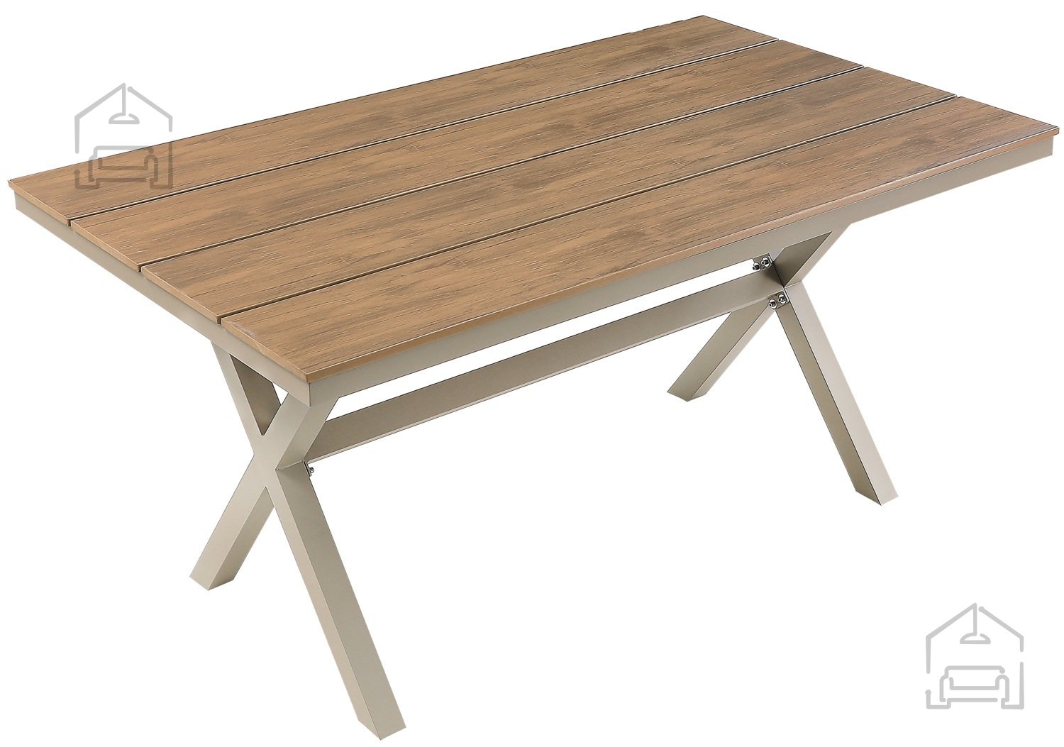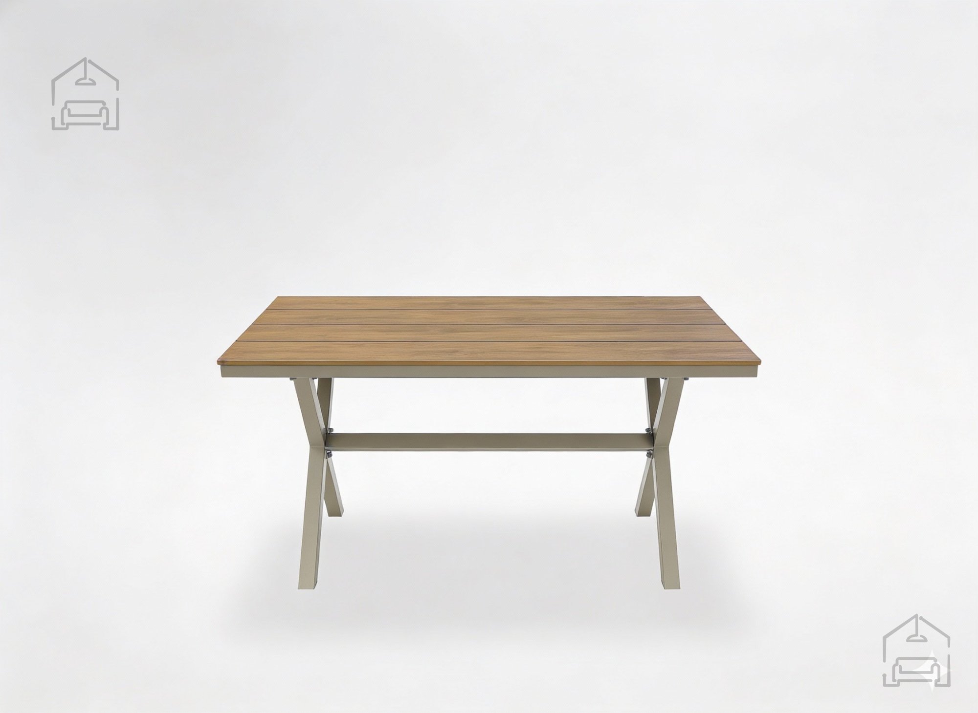 Spoznajte sodobno vrtno mizo, ki združuje minimalističen dizajn, visoko trpežnost in udobje pri vsakodnevni uporabi. Bež aluminijasta konstrukcija v kombinaciji z lesenim videzom plošče iz umetnega materiala se odlično poda k zasnovi vrta, terase ali dvorišča 🌿✨ To je univerzalna rešitev tako za zasebne kot komercialne prostore ☀️🍽️