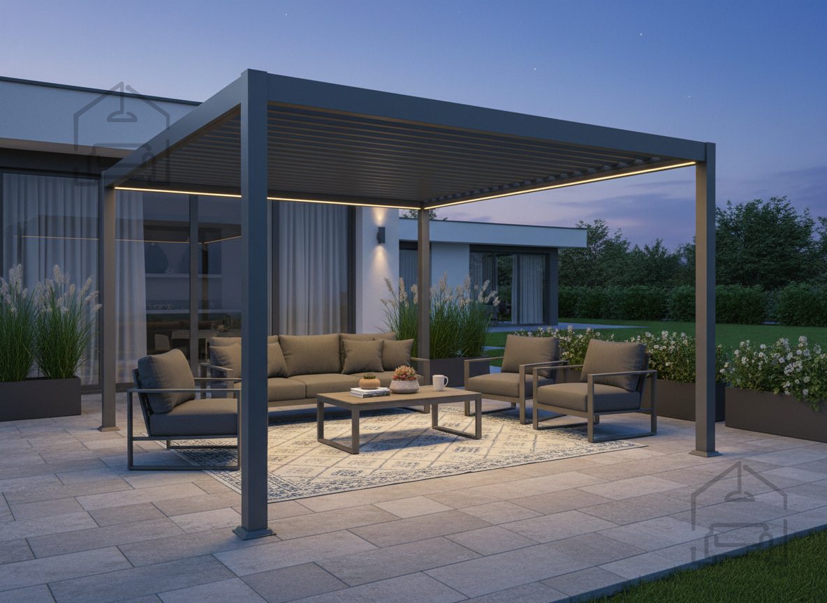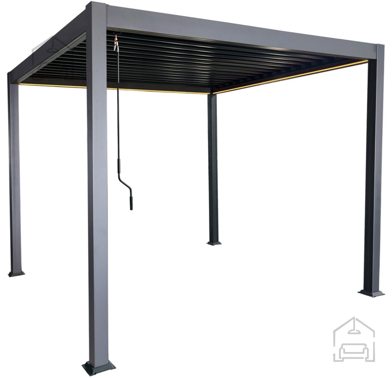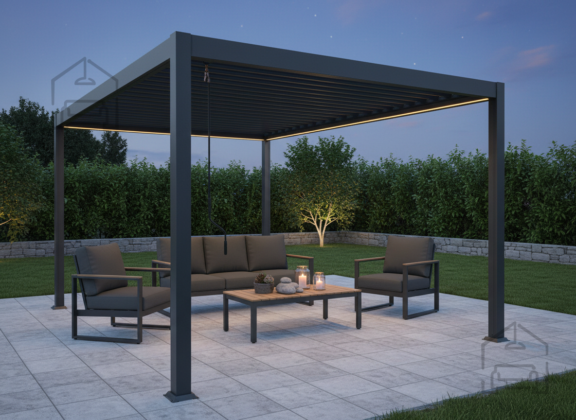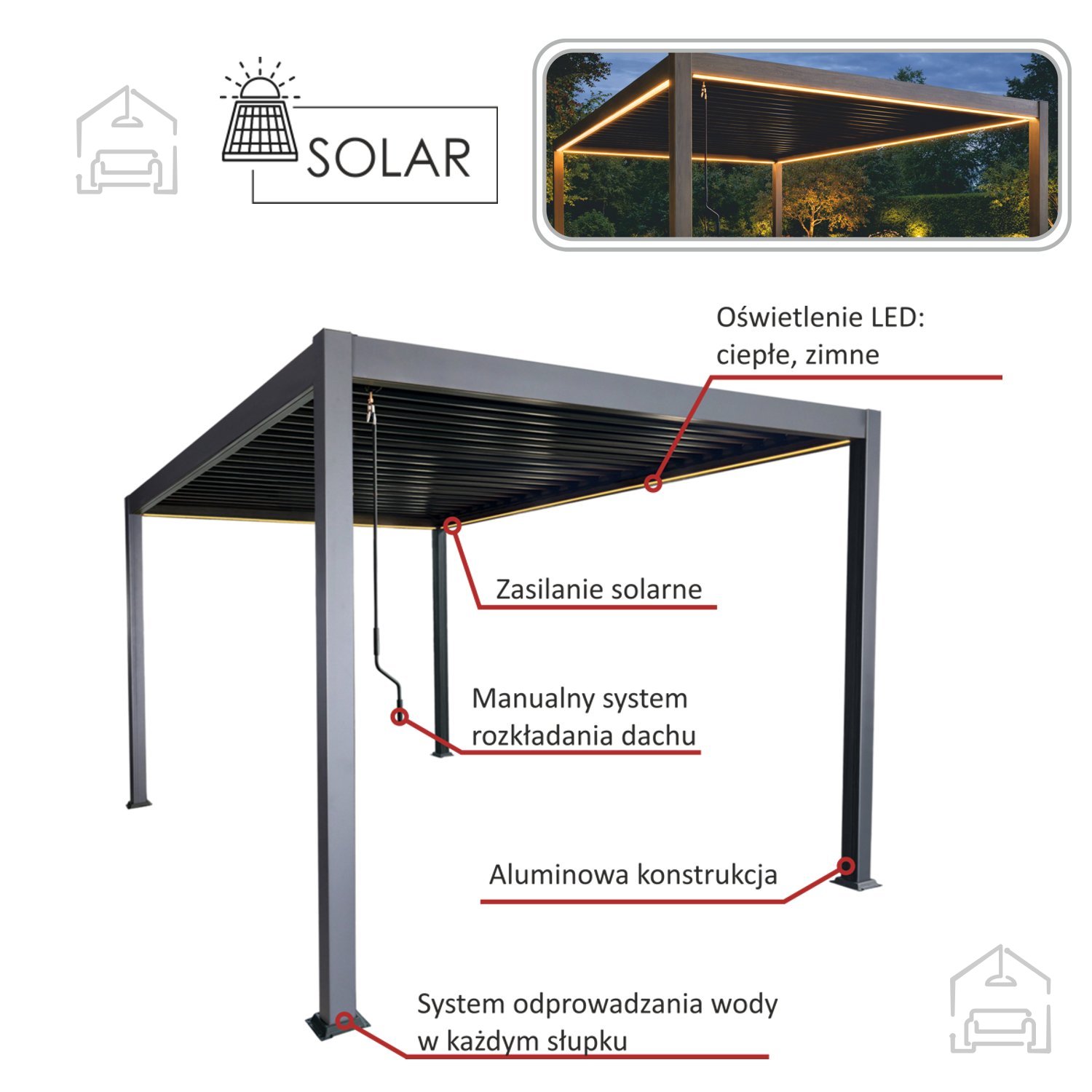 Posebnost te pergole so aluminijaste lamele dimenzij 185×34 mm, ki so vgrajene v zgornji del konstrukcije. V stranske prečke so integrirane solarne svetilke, ki napajajo LED osvetlitev. Energijo za delovanje svetilk zagotavlja solarni panel, kar pomeni, da pergola ne potrebuje priklopa na električno omrežje. To omogoča popolno svobodo postavitve, saj jo lahko umestite kjerkoli na prostem, kjer je dovolj sončne svetlobe za polnjenje solarnih celic. LED osvetlitev ustvarja prijetno vzdušje ob večernih urah in povečuje funkcionalnost prostora tudi po sončnem zahodu.
