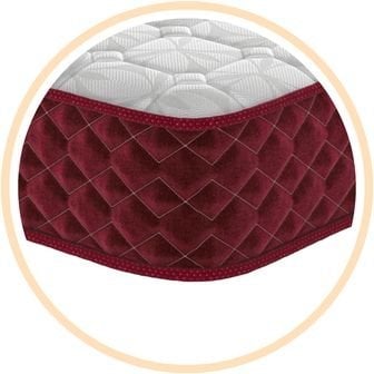Za zunanjo prevleko je uporabljen Double Jacquard v kombinaciji z Red Velvet Jacquard. Gre za dvoslojno žakardno tkanino z gosto strukturo, ki je hkrati mehka in izjemno odporna proti obrabi. Dobro prepušča zrak, ne povzroča statične elektrike in ohranja obliko tudi po večkratnem pranju. Zaradi svoje trpežnosti in videza daje vzmetnici eleganten, a praktičen značaj.
